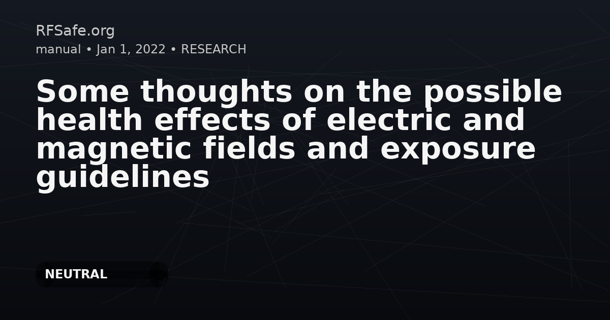 Some thoughts on the possible health effects of electric and magnetic fields and exposure guidelines Barnes F, Freeman Jr ER. Some thoughts on the possible health effects of electric and magnetic fields and exposure guidelines. Frontiers in Public Health. Vol. 10. 2022. doi: 10.3389/fpubh.2022.994758. Abstract Concerns about the possible health effects from exposure to weak electric and magnetic (EM) fields have been debated since the early 1960s. It is now well established that biological systems respond to exposure to weak EM fields at energy levels well below the current safety guidelines which result in modification of their functionality without significant changes in temperature. These observations are adding to the debate over what should be done to protect the users of cellular telecommunications systems. Experimental results showing both increases and decreases in cancer cell growth rates and concentration of reactive oxygen species for exposure to nano-Tesla magnetic fields at both radio frequencies (RF) and extra low frequencies (ELF) are cited in this paper. Some theoretical models on how variations in EM exposure can lead to different biological outcomes and how feedback and repair processes often mitigate potential health effects due to long-term exposure to low-level EM energy sources are presented. Of particular interest are the application of the radical pair mechanisms that affect polarization of electrons, and nuclear spins and the importance of time-delayed feedback loops and the timing of perturbations to oscillations in biological systems. These models help account for some of the apparently conflicting experimental results reported and suggest further investigation. These observations are discussed with particular emphasis on setting future safety guidelines for exposure to electromagnetic fields in cellular telecommunications systems. The papers cited are a very small fraction of those in the literature showing both biological effects and no effects from weak electric and magnetic fields. Excerpts The central problems to be solved include: 1. Determining the exposure amplitude, polarization and duration of electromagnetic fields at specific positions of interest in the body as a function of the exposing fields as a function of time. 2. Determining causal relationships between long duration exposure to low-level EM fields and the various biological responses reported in current research. 3. Quantifying the interactions between EM fields and biology with measurements that are not only accurate but repeatable. Some of the low energy EM effects on micro-biological systems are well documented in laboratory experiments but are difficult to translate to macro-biological system responses. 4. Sorting out which aspects of biological systems are directly driven by RF fields vs. the myriad of other independent variables at work. 5. Understanding how the repair mechanisms in biological systems alter biological processes in the presence of low-level EM fields. Several issues confront regulators: 1. Should regulations be set that “protect” all the population all the time, including those with other health conditions that make them more susceptible to EM exposure, or should regulations only protect most of the population most of the time. The degree of control has huge implications on cost and efficacy. 2. Simplifying the explanations of the physical mechanisms involved such that there is general acceptance of the need for regulation is a non-trivial part of the regulatory process. Scientists, producers, operators, and users have differing imperatives that need to be considered. Such situations invite a lot of political hubris and conflict. 3. How regulators quantify and then rationalize the tradeoffs between the economic and social benefits of cellular technology vs. potentially damaging health effects of long-term exposure to low levels of EM energy is important in determining the regulations that are proposed. Four strategies for reducing RF exposure might include: 1. Designing the transmitter in user devices to reduce the instantaneous RF power levels emitted is the most direct way to reduce RF exposure but this has serious system performance implications and high implementation costs. Manufacturers already try to minimize the instantaneous RF power output of cell phones to maximize battery life. Further reductions in RF power output will significantly impact signal to noise ratio and reduce the maximum range of any given phone within a cell phone tower matrix. This will have a significant impact on system infrastructure (number of cell phone towers needed to provide coverage) and operating cost. Another technique for reducing instantaneous power output absorbed by users is to use narrow beam directional antennas in user devices that focuses the output power on the closest cell tower receiver. This approach is being incorporated into 5G systems. Size and weight considerations are a major constraint in mobile devices. 2. Reducing the density of RF power (Watts/M2) being absorbed by the body of a user can also be accomplished by increasing the distance between the transmitting antenna and the user's body and head. Power density falls off very rapidly with increasing distance from the transmitting antenna typically as 1/Rn reduction where n is a number usually >1. It is to be noted that increasing use of data and moving a smart phone away from the body reduces the power levels incident on the head. 3. Research data indicates biological effects of RF signals are frequency dependent. Redesigning transmitters to eliminate frequencies that are proven to produce biological effects could be employed, but this could have a significant impact on system capacity since each frequency band carries a lot of data in today's system. 4. The last, and least expensive approach is to limit cumulative user exposure to RF energy in a given period of time by shutting the phone “Off”. Establi