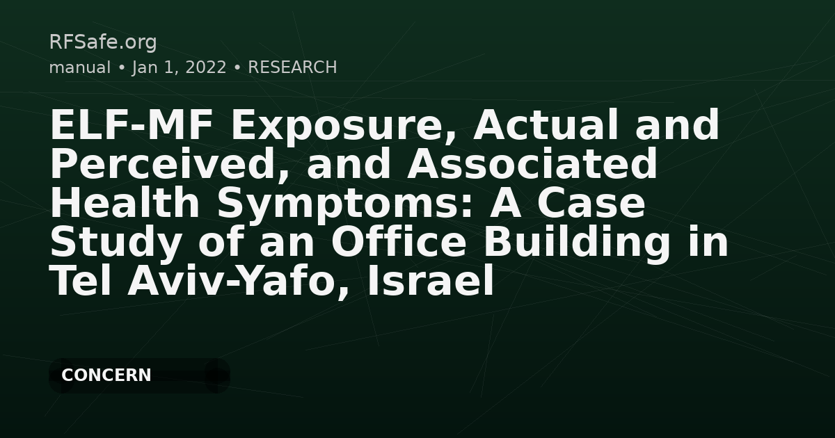 ELF-MF Exposure, Actual and Perceived, and Associated Health Symptoms: A Case Study of an Office Building in Tel Aviv-Yafo, Israel Raz-Steinkrycer LS, Dubnov J, Gelberg S, Jia P, Portnov BA. ELF-MF Exposure, Actual and Perceived, and Associated Health Symptoms: A Case Study of an Office Building in Tel Aviv-Yafo, Israel. Sustainability. 2022; 14(17):11065. doi.org. Abstract Empirical studies link exposure to extremely low frequency magnetic fields (ELF-MFs) to several health symptoms. However, it is unclear whether these symptoms are associated with actual or perceived exposure. In this study we attempted to answer this question by studying the health complaints of employees working in a multi-story office building located near a major high-voltage power line. ELF-MF measurements were conducted in the building using a triaxial sensor coil device on all 15 floors. In parallel, questionnaires were administered to evaluate the prevalence of various health symptoms among the employees. Multivariate logistic regressions were used next to quantify the associations between actual and perceived ELF-MF exposure and the employees’ health complaints. The analysis revealed that feelings of weakness, headache, frustration, and worry were associated with both measured and perceived ELF-MF exposure (p < 0.01), while perceived ELF-MF exposure was also found to be associated with eye pain and irritation (OR = 1.4, 95% CI = 1.2–1.6), sleepiness (OR = 1.3, 95% CI = 1.1–1.5), dizziness and ear pain (OR = 1.2, 95% CI = 1.0–1.4). We conclude that high-voltage power lines produce both physiological and psychological effects in nearby workers, and, hence, proximity to such power lines should become a public health issue. Conclusions The main findings of this study can be summarized as follows: • The analysis revealed no significant association between instrumentally measured and perceived ELF-MF exposure, which implies that individuals cannot detect actual ELF-MF exposure accurately; • The analysis revealed that feelings of weakness, headache, frustration and worries were associated with both measured and perceived ELF-MF exposure, while perceived ELF-MF exposure was also found to be associated with eye pain and irritation, sleepiness, as well as dizziness and ear pain. • As we conclude, working near a high voltage power line appears to produce not only psychological but also physiological effects, and should thus become a public health concern. As several reported symptoms (including headache, frustration/worry, and exhaustion/weakness) were found to be significantly related to measured exposure, not just perceived exposure, the results should lead to revisiting ELF-MF exposure standards. Moreover, follow-up studies should attempt to estimate other effects of ELF-MF exposure, such as its effects on employee productivity, the number of visits to physicians, absenteeism, and medication intake. Open access paper: mdpi.com