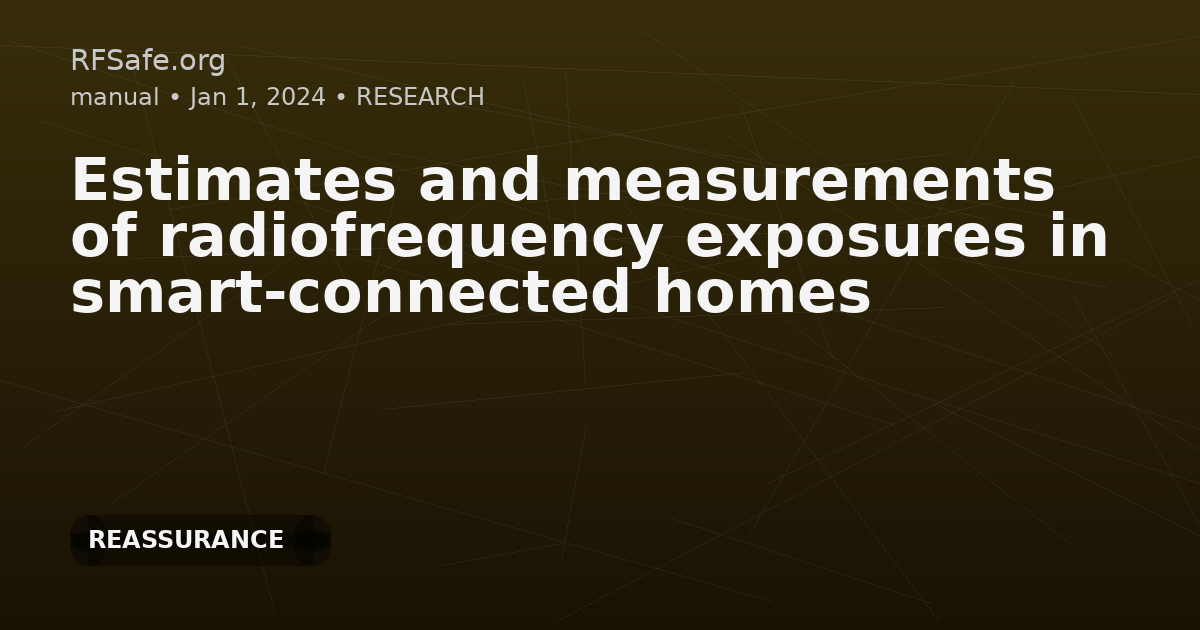 Estimates and measurements of radiofrequency exposures in smart-connected homes Joyner K, Milligan M, Knipe P. Estimates and measurements of radiofrequency exposures in smart- connected homes. Bioelectromagnetics. 2024 Jul 18. doi: 10.1002/bem.22518. Abstract The aim of this research was to quantify the levels of radiofrequency electromagnetic energy (RF-EME) in a residential home/apartment equipped with a range of wireless devices, often referred to as internet of things (IoT) devices or smart devices and subsequently develop a tool that could be useful for estimating the levels of RF-EME in a domestic environment. Over the course of 3 years measurements were performed in peoples' homes on a total of 43 devices across 16 device categories. Another 12 devices were measured in detail in a laboratory setup. In all a total of 55 individual devices across 23 device categories were measured. Based on this measurement data we developed predictive software that showed that even with a single device in 23 device categories operating near maximum they would, in total, produce exposures at a distance of 1 m of 0.17% of the ICNIRP (2020) public exposure limits. Measurements were also made in two separate smart apartments—one contained over 50 IoT devices and a second with over 100 IoT devices with the devices driven as hard as could reasonably be achieved. The respective 6-min average exposure level recorded were 0.0077% and 0.44% of the ICNIRP (2020) 30- min average public exposure limit. Excerpts .... Based on all of these measurements, we have developed predictive software that can be used to estimate exposure levels on a conservative basis by incorporating a 3 dB enhancement to produce a realistic upper bound for the exposure estimation. The RF estimator tool, which is available from the Mobile & Wireless Forum (MWF) website (mwfai.org), has a drop-down menu that allows the selection of multiple IoT devices and separation distances and returns an estimate of the exposure level that could be expected in the home environment. Devices in neighboring rooms can be included in the software by selecting the appropriate device and distance. However, because of the inverse square dependence with distance and the attenuation through walls, the majority contribution in a particular room is determined by the proximity of devices in that room. Future work will include the expansion of the device categories and the inclusion of wall/window attenuation to account for neighboring homes and apartments. CONFLICT OF INTEREST STATEMENT This work was fully funded by the Mobile and Wireless Forum (mwfai.org) and that KJ and MM are contractored by the MWF. Open access paper: onlinelibrary.wiley.com