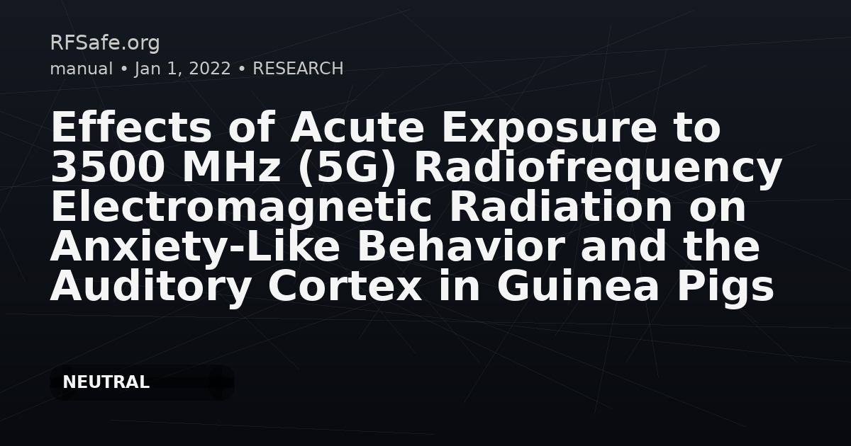 Effects of Acute Exposure to 3500 MHz (5G) Radiofrequency Electromagnetic Radiation on Anxiety-Like Behavior and the Auditory Cortex in Guinea Pigs Yang H, Zhang Y, Wu X, Gan P, Luo X, Zhong S, Zuo W. Effects of Acute Exposure to 3500 MHz (5G) Radiofrequency Electromagnetic Radiation on Anxiety-Like Behavior and the Auditory Cortex in Guinea Pigs. Bioelectromagnetics. 2022 Jan 23. doi: 10.1002/bem.22388. Abstract Numerous studies have shown that radiofrequency electromagnetic radiation (RF-EMR) may negatively affect human health. We detected the effect of 3500 MHz RF-EMR on anxiety-like behavior and the auditory cortex (ACx) in guinea pigs. Forty male guinea pigs were randomly divided into four groups and exposed to a continuous wave of 3500 MHz RF-EMF at an average specific absorption rate (SAR) of 0, 2, 4, or 10 W/kg for 72 h. After exposure, malondialdehyde (MDA) levels, antioxidant enzyme activity, anxiety-like behavior, hearing thresholds, cell ultrastructure, and apoptosis were detected. Our results revealed that hearing thresholds and basic indexes of animal behavior did not change significantly after exposure (P > 0.05). However, the MDA levels of ACx were increased (P < 0.05), and catalase (CAT), superoxide dismutase (SOD), and glutathione peroxidase (GSH-px) activities were decreased (P < 0.05) in the exposure groups compared to the sham group. Ultrastructural changes of ACx, including swollen mitochondria and layered myelin sheaths, were observed. Cytochrome-c relocalization, caspase-9, and cleaved caspase-3 activation were detected in the exposure groups. In conclusion, these results suggest that oxidative stress is an important mechanism underlying the biological effects of RF-EMR, which can induce ultrastructural damage to the ACx and cell apoptosis through a mitochondria-dependent mechanism. Moreover, oxidative stress, apoptosis induction and ultrastructural damage increase in a SAR-dependent manner. However, RF-EMR does not increase hearing thresholds or induce anxiety. pubmed.ncbi.nlm.nih.gov