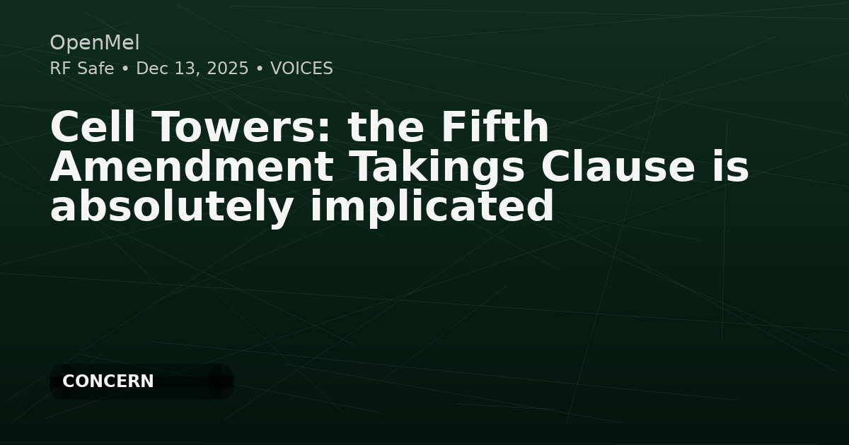 An RF Safe commentary argues that radiofrequency emissions from cell towers should be treated as a “physical invasion” of private property under the U.S. Constitution’s Fifth Amendment Takings Clause. The author claims courts and agencies have misframed RF exposure as a regulatory issue rather than a per se physical occupation, citing Supreme Court takings precedents (e.g., Loretto and Cedar Point). The piece also asserts that federal law (referencing Section 704) limits objections on health grounds, strengthening the need for a takings-based legal theory.