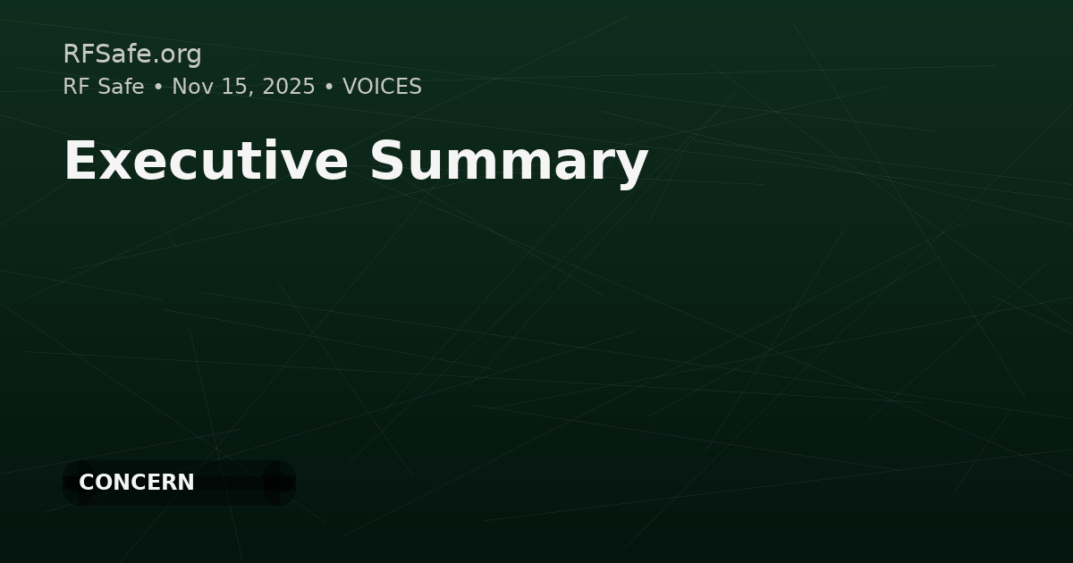 RF Safe’s “Executive Summary” argues that non-thermal radiofrequency/microwave exposures from modern wireless technologies can disrupt biological processes, proposing ion-channel voltage-sensor interference as a key mechanism leading to oxidative stress and inflammation. It cites animal studies (NTP and Ramazzini) and claims a WHO-commissioned 2025 systematic review found “high certainty” evidence of increased cancer in animals, and it points to epidemiological trends as suggestive. The piece also criticizes U.S. regulation as focused on thermal effects, highlighting FCC limits dating to 1996 and referencing a 2021 U.S. court ruling that faulted the FCC for not addressing non-thermal evidence.