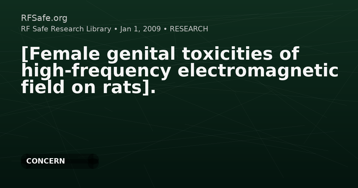 This rat study examined sub-chronic exposure to a 30 MHz electromagnetic field at 0–1600 V/m for 8 hours/day, 5 days/week, over 56 days. The authors report no change in ovarian wet weight, but dose-related changes in estrous cycle timing, reproductive hormones (higher LH and lower E2 at higher exposures), and ovarian follicle composition. Ovarian ultrastructure reportedly appeared more abnormal with increasing exposure level, and the authors conclude HF-EMF exposure is associated with female gonadal toxicities in this model.