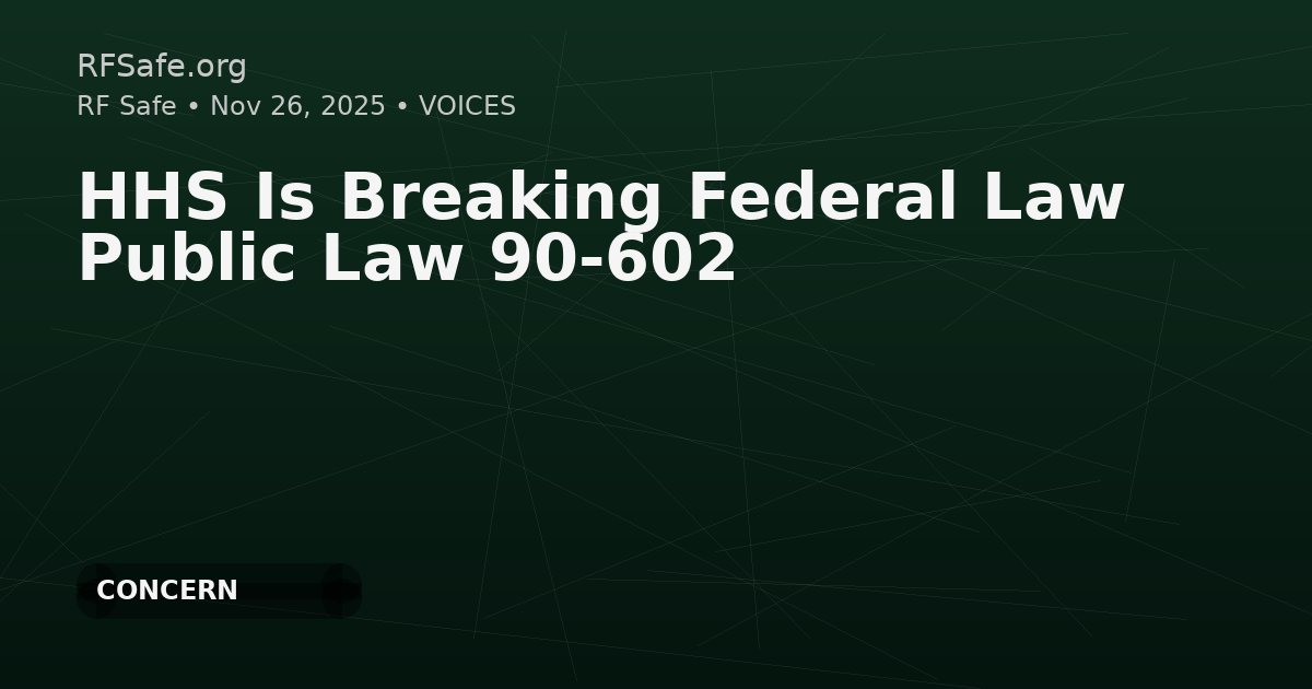 An RF Safe commentary argues that the U.S. Department of Health and Human Services (HHS) is violating Public Law 90-602 by failing to continuously update radiation-safety standards, asserting that no formal revisions have occurred since the mid-1980s. The post links this alleged inaction to continued public exposure from wireless technologies and calls for renewed long-term research and stricter exposure limits. It also claims the National Toxicology Program (NTP) was shut down in 2024 and references a 2021 court decision criticizing FCC RF rules, urging congressional action and new legislation.