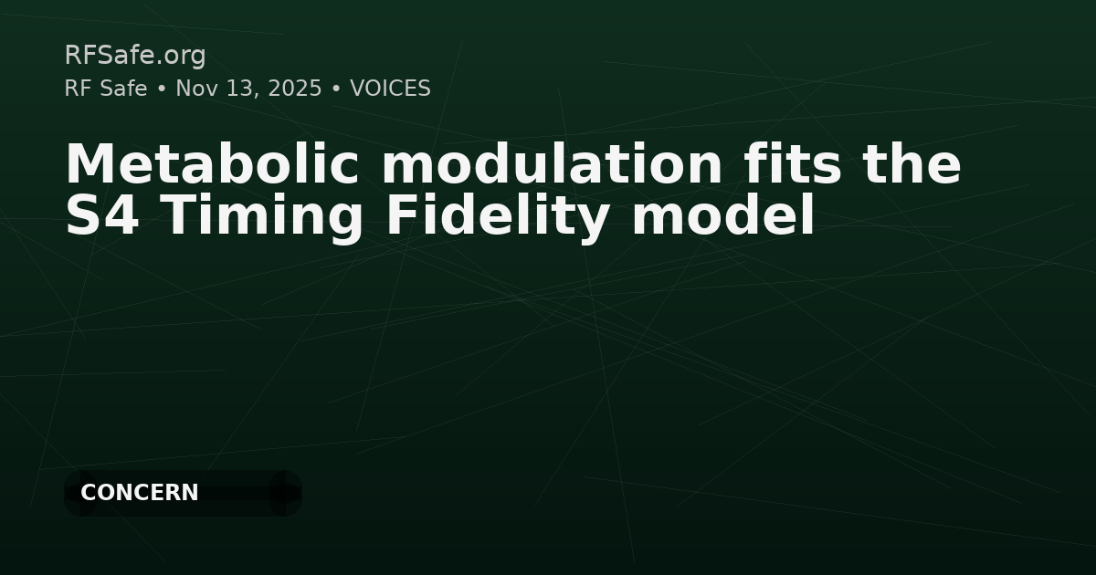 RF Safe argues that an acute laboratory finding—reported as increased ad-libitum energy intake after brief 3G handset exposure versus sham—supports its proposed “S4 Timing Fidelity” mechanism for non-thermal RF effects. The post links the behavioral outcome to hypothalamic energy-sensing and autonomic changes via voltage-gated ion channel (VGIC) gating perturbations, and further connects this to mitochondrial/oxidative phosphorylation signaling. It also frames electromagnetic hypersensitivity (EHS) as a sensitivity phenotype and proposes testable predictions involving pulse structure and physiological correlates (e.g., HRV, EEG).